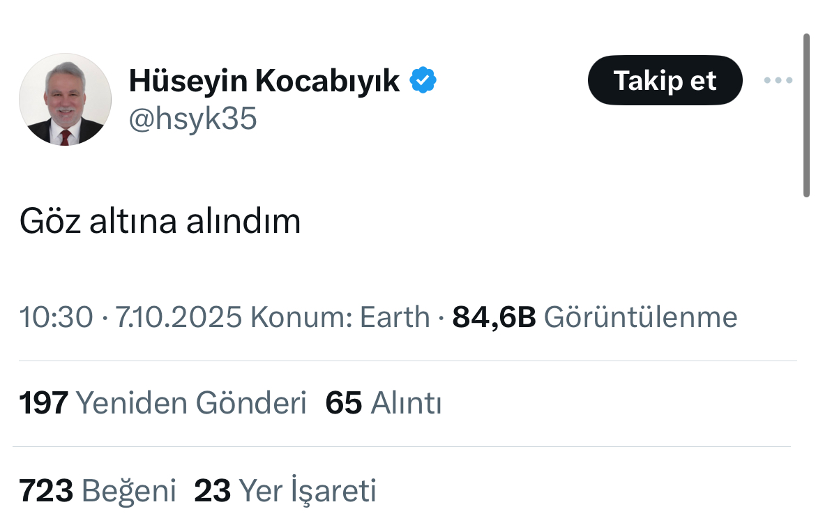 AKP 25. ve 26. Dönem İzmir Milletvekili Hüseyin Kocabıyık sosyal medya hesabından yaptığı paylaşımla gözaltına alındığını duyurdu.