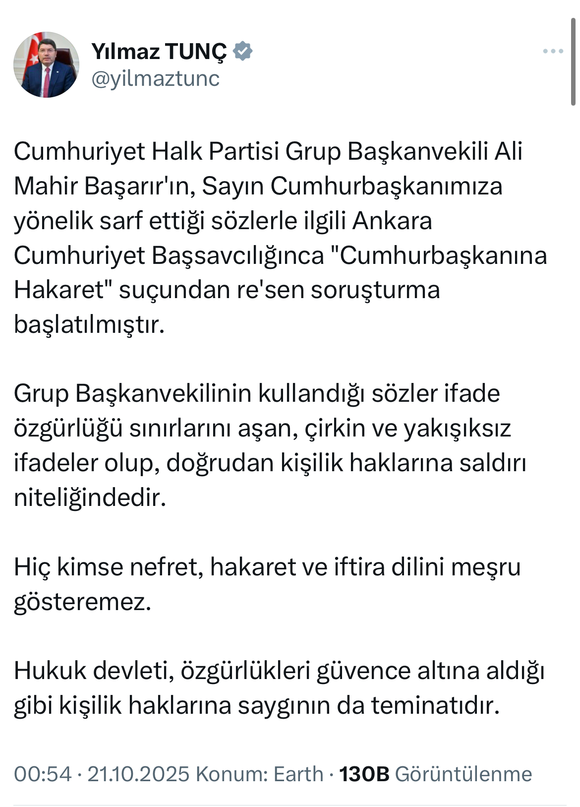 Adalet Bakanı Yılmaz Tunç, CHP Grup Başkanvekili Ali Mahir Başarır’a Ankara Cumhuriyet Başsavcılığı’nca “Cumhurbaşkanına hakaret” suçundan re’sen soruşturma başlatıldığını duyurdu.