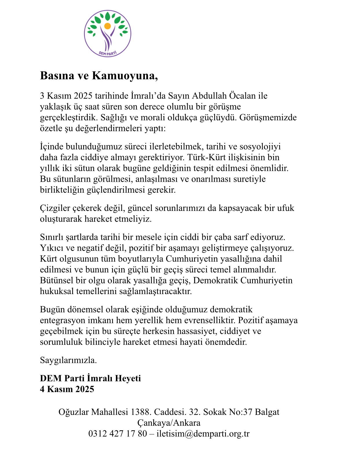 3 Kasım 2025 tarihinde İmralı’da Sayın Abdullah Öcalan ile yaklaşık üç saat süren son derece olumlu bir görüşme gerçekleştirdik. Sağlığı ve morali oldukça güçlüydü. Görüşmemizde özetle şu değerlendirmeleri yaptı:
