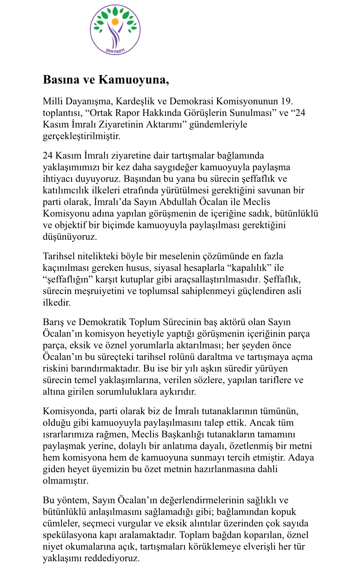Milli Dayanışma, Kardeşlik ve Demokrasi Komisyonunun 19. toplantısının “Ortak Rapor Hakkında Görüşlerin Sunulması” ve “24 Kasım İmralı Ziyaretinin Aktarımı” gündemleriyle gerçekleştirilmesi akabinde DEM Parti Komisyon üyeleri tutanakların bütünlüklü ve objektif bir biçimde kamuoyuyla paylaşılması gerektiğini düşündüklerini ifade etti.