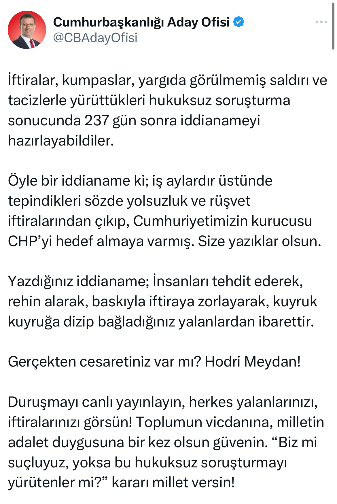 İstanbul Cumhuriyet Başsavcılığı’nın İBB iddianamesini mahkemeye sunmasınjn akabinde tutuklu İBB Başkanı Ekrem İmamoğlu, sosyal medya hesabından yaptığı paylaşımla, “Duruşmayı canlı yayınlayın, herkes yalanlarınızı, iftiralarınızı görsün” dedi.