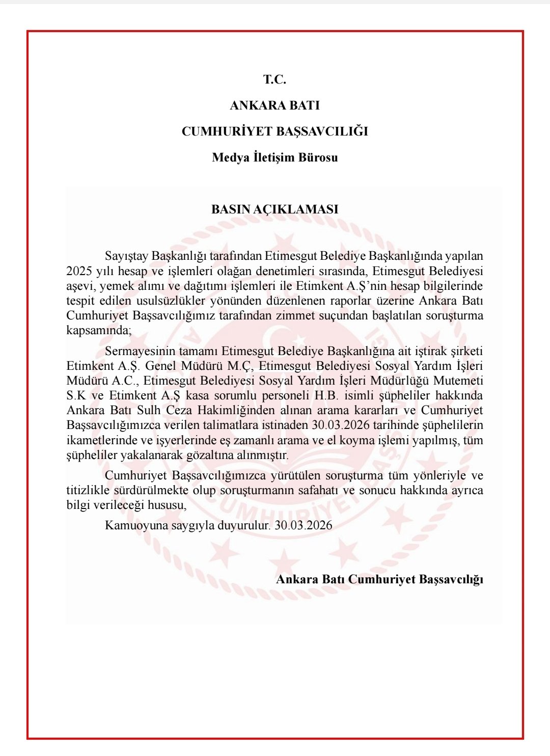 Etimesgut Belediyesi'ne yönelik yapılan operasyon ile ilgili Ankara Batı Cumhuriyet Başsavcılığı'nın açıklaması şöyle: