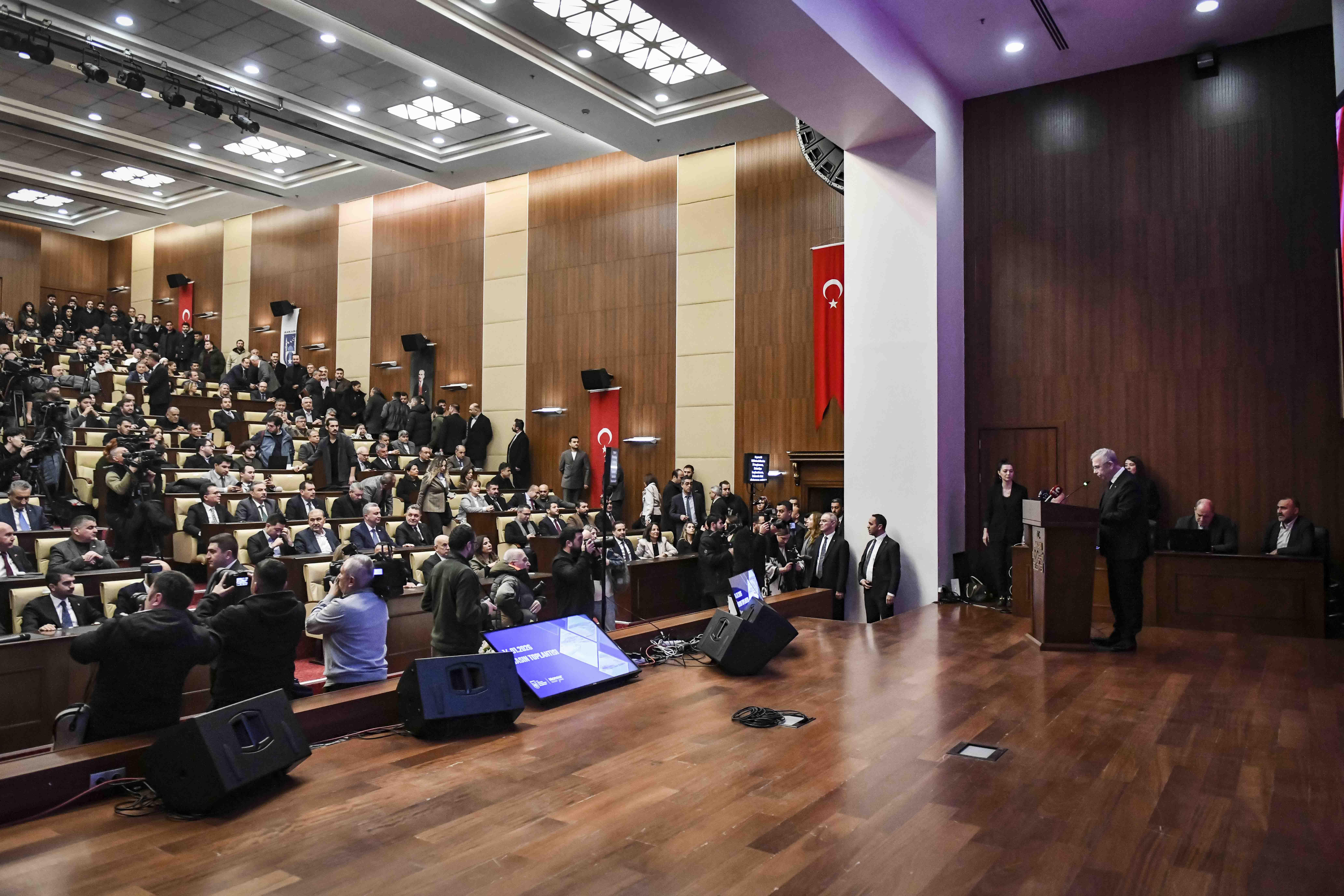 Yedi yıldır biz hiçbir şey yapmamışız. Böyle bir haber hazırlıyorlar. Daha önce TRT'ye bir çağrı yapmıştım. Buradan bir kez daha çağrı yapıyorum. Nedir bu telaşınız? Şu anda Ankara'da tüm musluklardan su akıyor arkadaşlar. Hiçbir tane kesinti yok. Telaş ne? Bu karalama kampanyasının mutlaka bir amacı olması lazım. O amacın ne olduğunu biliyoruz ve arkasına şunu söyleyecekler. Ankara'da salgın hastalık başlıyor. İnsanlar leğenle çamaşır yıkıyor. Şehir susuz kaldı gibi sahte haberlere de bundan sonra hazır olun. Ama ASKİ, Ankara Büyükşehir'e bağlı o konuşan insanlar dahil ilçe yöneticileri dahi hepsinin ne kadar su kullandığını görüyoruz. Hepsini dezenformasyondan halka panik yaratmaktan dolayı da götüreceğiz. Bunların hepsini savcılığa vereceğiz. TRT'ye sesleniyorum veya İletişim Başkanlığı'na. Sizler bu ülkenin 86 milyon vatandaşın vergileriyle yayın yapan bir kurumsunuz. Onlarla faaliyet yapıyorsunuz. Halkın parasını kullanıp halka yalan söylemeye lütfen utanın. Haber merkezlerinde kurulan WhatsApp gruplarında su akmayan çeşme bulun. Gidin oradan yayın yapın. Tankerle su verilen bir yer bulun. Ne pahasına olursa olsun görüntü çıkaran şekilde talimatlar verildiğini bilmediğimizi sanıyorsunuz. WhatsApp gruplarında bizi sevenler bu yazışmaları bize gönderiyorlar ve şimdi de bütün Türkiye biliyor. Şunu açıkça söylüyorum. O dosya haberi yayınlandığı gün TRT hakkında bir suç bir kez daha suç duyurusunda bulunacağım. Sabah sekiz, akşam sekiz Ankara'nın her noktasında trafik yayını yapacaksınız diye muhabirlere, emekçilere baskı kurmuyor musunuz? Onu da biliyoruz. Merak etmeyin. Ankara'da Cumhuriyet tarihi boyunca iki milyon araç olmuş. 2019’dan 2025’e kadar 2026’nın başına kadar bir milyon araç eklenmiş. Şu anda yedi yüz bin nüfus artışımız var. Elbette bunu kurumlarla iş birliği yaparak ve en son teknolojiyi kullanarak çözmek için de Ankara Büyükşehir olarak elbette geleni yapacağız. Sonuna kadar da uğraşacağız. Evet, şu imalatları 2026’ya kadar yapılanları da hızlıca geçelim. Çabuk geçin arkadaşlar. Sadece ne oldu okunsun yeter. Devam edelim. Çünkü biliyoruz ki eski dönemlerde yerin altına yapılan hizmet kimse tarafından görmez diye hizmet pek yer altına yapılmıyordu. Evet. ASKİ, hangi çalışmaları yaptı ayrıca? Şimdi bakın ASKİ’nin bütçe gelir gerçekleşmeleri topal ördek olduğumuz dönemde ASKİ’nin su fiyatları çok aşağıda düşürüldü. Kendi dönemlerinde iki mislinden daha fazla para alıp bu parayı başka hizmetlere aktarırken ancak 2019’dan sonra mecliste azınlık olmamız nedeniyle gelirimiz arttı. Bir bakın 2017’de 40 milyar lira olan ASKİ’nin geliri 2021’de on üç noktaydı. 2014’te 2022’de 4,7’ye indi. 2025’te seçimden sonra ilk defa biz normal fiyat zararın altına olmayan fiyata şu anda su vermeye başlayabildik. Evet, Bütçelerimizin arasındaki 2012-2018’deki Aski'nin bütçesiyle 2019-2025 arasındaki ASKİ’nin bütçesini de görüyorsunuz. Yapımı tamamlanan büyük çaplı içme suyu hatları var. 220 bin metre çelik içme suyu hattı. İvedik temelli devam hızlı geçer. Bu İvedik-Temelli boru hattı 2005 yılı ASKİ Master Planı’nda Polatlı'ya içme suyu hattını 2014’e kadar tamamlayın denmiş. Yaptılar mı arkadaşlar? Bize geldi. Peki bize geldi ilk Belediye Meclis toplantısında Polatlı'ya su götürmek için ihale yapmak için bir kredi talebinde bulundu. Reddedildi. Mahkeme kararıyla biz ancak bu haklarımızı alıp da Polatlı’nın ihalesini yapabildik. Lütfen yedi yıldır bunları niye yapmayın diyenler, ilk beş yıldaki su fiyatlarındaki ucuzluk ve bu tür engellemeleri lütfen unutmasınlar. Devam edelim, devam edin.Şu anda Keçiören'de Dünya Bankası kredisiyle yaptığımız bir milyar liralık bir yatırım var. Devam edelim. Çünkü Keçiören'de geçen insan ölüyordu. 1984 yılında yapılmış, nüfus 300 bin arkadaşlar. Hiçbir kanal değişmeden şu anda bir milyon nüfusa gelmiş. Aynı kanalların yapılması mümkün mü? Şimdiye kadar hiç kimse bu işle uğraşmamış. Ama biz, eskiden yapılmamış ne yapalım, biz de yapmayalım diye bir tavra giremezdik ve derhal başladık. Çankaya ilçesine gene aynı şekilde, Mamak Boğaziçi Mahallesi'nde. Evet devam edin. Mamak'ta, Yenimahalle’de Elektroken sürekli sel basıyordu. Ergazi yapıldı, Sincan Mustafa Kemal Mahallesi, Etimesgut İstasyon Caddesi'ni biliyorsunuz; bir elektrik çarpmasıyla bir hemşerimiz vefat etmişti selden dolayı. Akyurt Ulu Pınar Deresi, Altındağ Çevreli Caddesi, Gölbaşı. Ve ASKİ imkânlarıyla dış kredi de bulduk arkadaşlar. Şu anda İvedik arıtma suyu yetmiyor artık, Ankara'nın nüfu su arttığı için. Şimdi dördüncü ünite kapasite artışı yapım işi ihale edildi, üç nokta altı milyar lira. Kınık tünel çıkışı İvedik Su Arıtma Tesisi, biraz sonra bunun görüntülerini göstereceğiz. İki nokta dokuz milyar, niye, biraz sonra göstereceğiz. Parasını biz ödüyoruz ama Devlet Su İşleri hiç biz yokmuşuz gibi biz yapıyoruz deyip bunu açıklıyor. Yapsın elbette, onun kanuni görevidir.