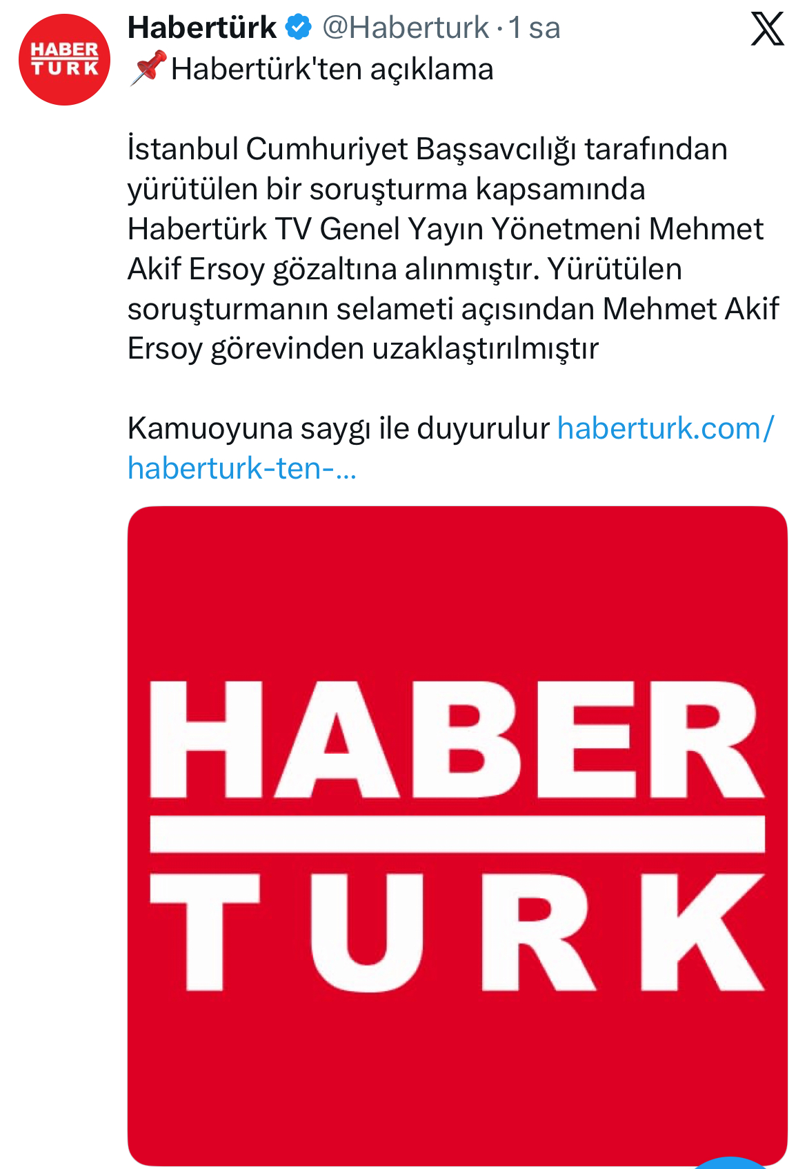 "İstanbul Cumhuriyet Başsavcılığı tarafından yürütülen bir soruşturma kapsamında Habertürk TV Genel Yayın Yönetmeni Mehmet Akif Ersoy gözaltına alınmıştır.