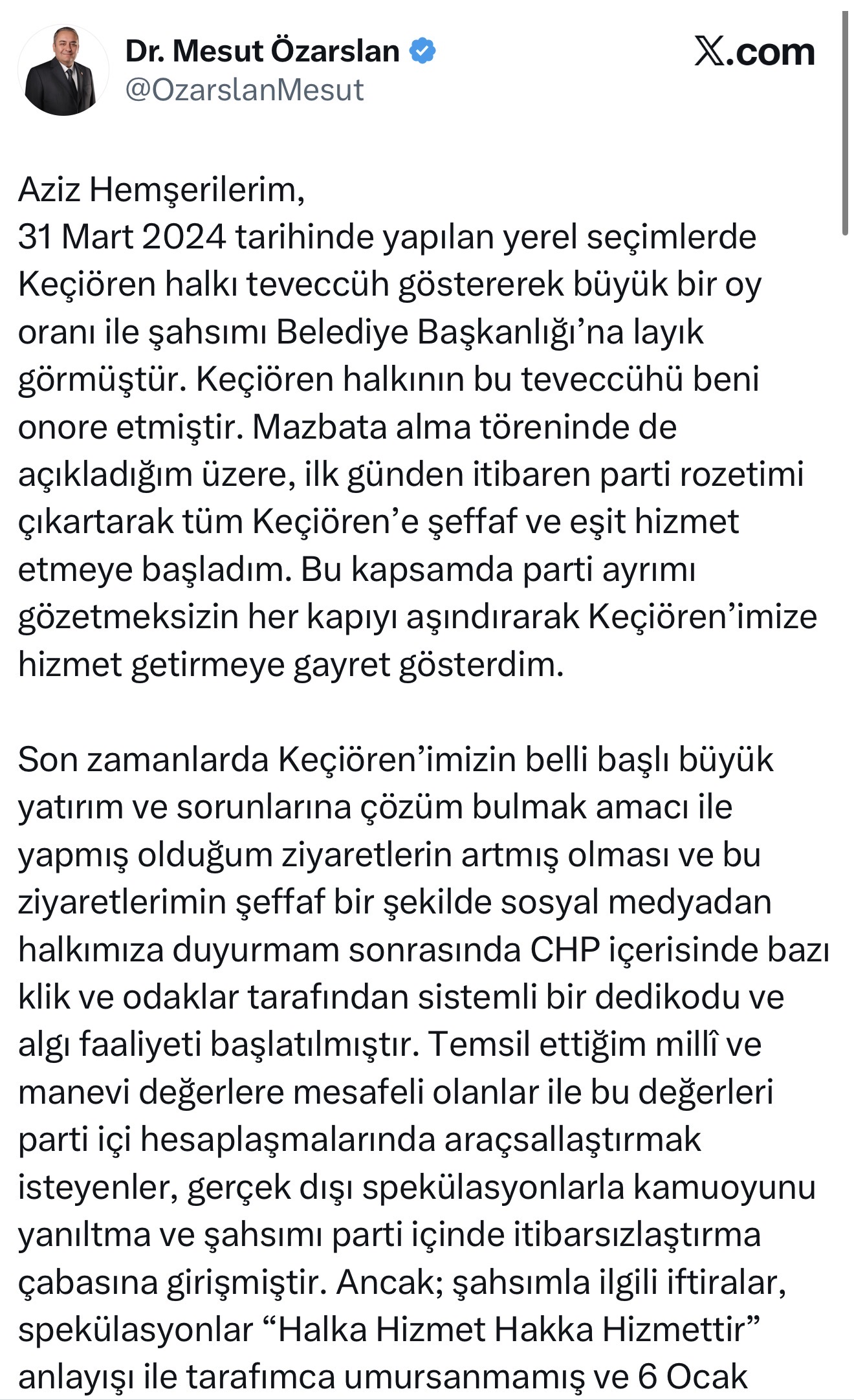 Son zamanlarda Keçiören’imizin belli başlı büyük yatırım ve sorunlarına çözüm bulmak amacı ile yapmış olduğum ziyaretlerin artmış olması ve bu ziyaretlerimin şeffaf bir şekilde sosyal medyadan halkımıza duyurmam sonrasında CHP içerisinde bazı klik ve odaklar tarafından sistemli bir dedikodu ve algı faaliyeti başlatılmıştır. Temsil ettiğim millî ve manevi değerlere mesafeli olanlar ile bu değerleri parti içi hesaplaşmalarında araçsallaştırmak isteyenler, gerçek dışı spekülasyonlarla kamuoyunu yanıltma ve şahsımı parti içinde itibarsızlaştırma çabasına girişmiştir. Ancak; şahsımla ilgili iftiralar, spekülasyonlar “Halka Hizmet Hakka Hizmettir” anlayışı ile tarafımca umursanmamış ve 6 Ocak 2026 tarihinde, T.C. Çevre, Şehircilik ve İklim Değişikliği Bakanı Sayın Murat Kurum ile Keçiören’imizin sorunlarının çözümü amacıyla görüşme gerçekleştirilmiştir.