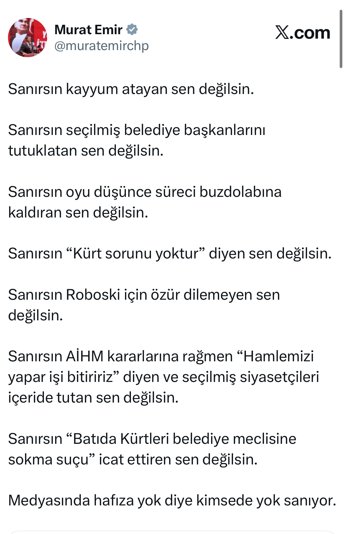 CHP Ankara Milletvekili ve Grup Başkanvekili Murat Emir, Cumhurbaşkanı ve AKP Genel Başkanı Recep Tayyip Erdoğan’ın grup toplantısı esnasında söylediği “Sayın Özel cesareti varsa, cellat görmek istiyorsa aynaya baksın” sözlerini sosyal medya hesabı X’ten yaptığı paylaşımla yanıtladı.
