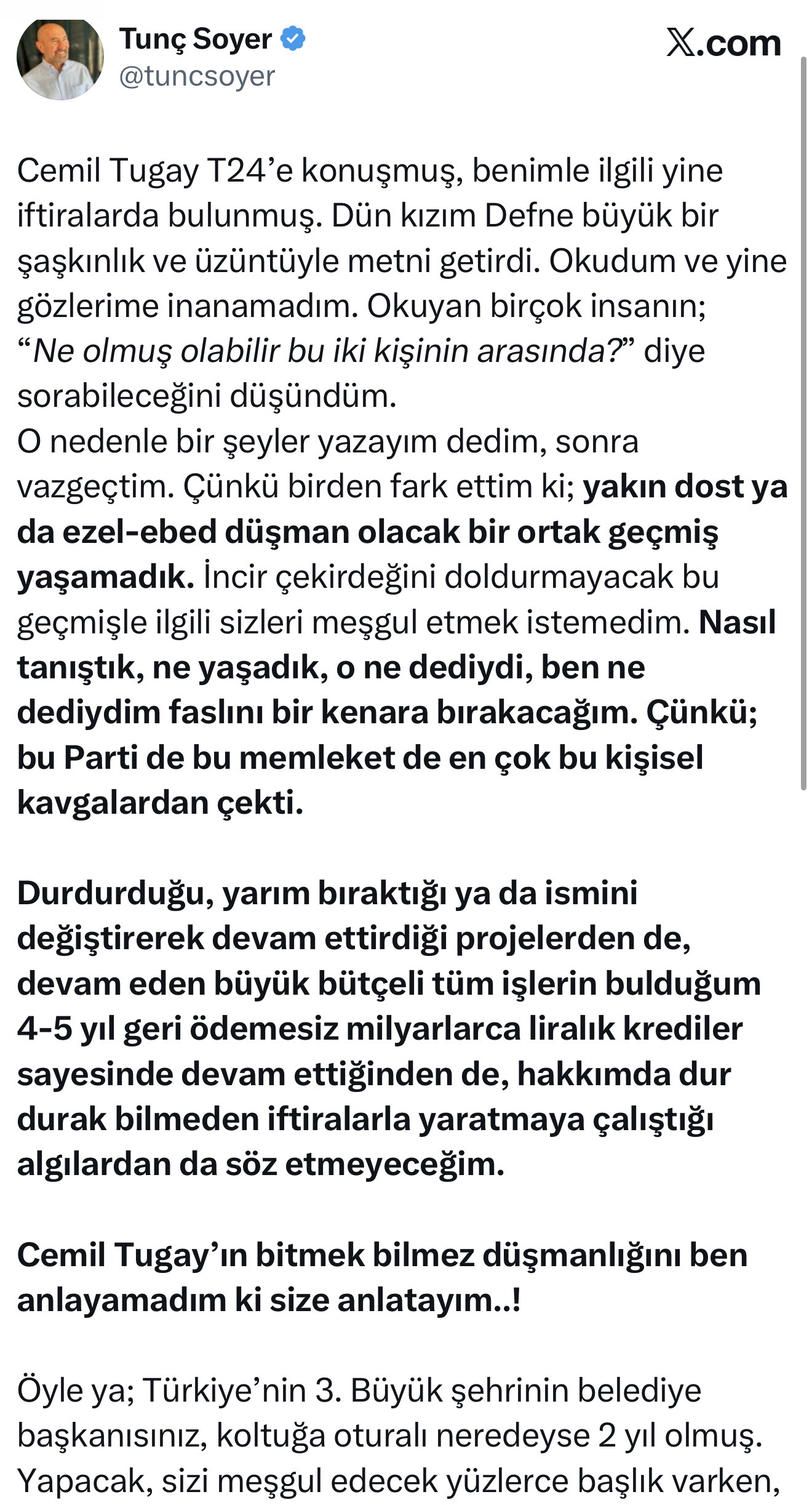 Tunç Soyer'in sosyal medya hesabından yaptığı paylaşımla Cemil Tugay'a verdiği yanıt şöyle: